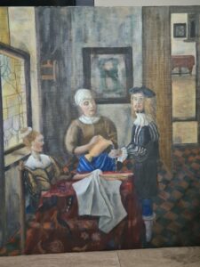 • April; Vermeer compositie gemaakt van het verdwenen werk met de omschrijving “de seigneur die zijn handen wast, met een doorkijkje en 2 beelden.