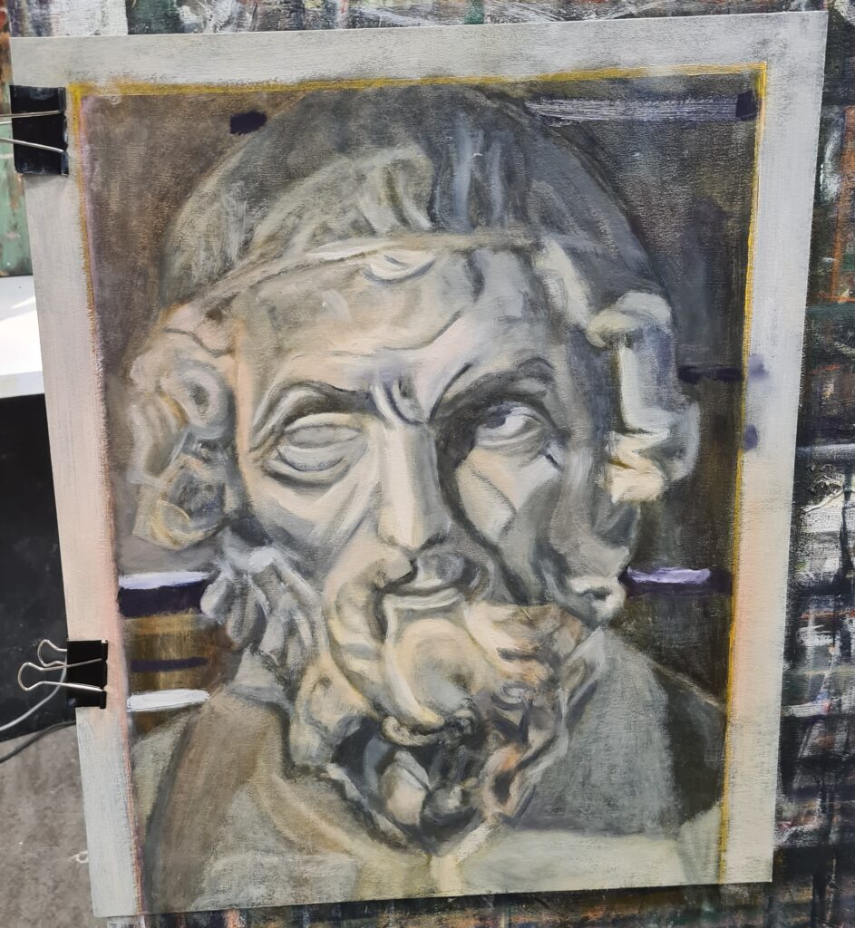 • April: Vermeer compositie gemaakt van het verdwenen werk met de omschrijving “de seigneur die zijn handen wast, met een doorkijkje en 3 beelden. Dit was mijn eerste compositie, eerste olieverfschilderij en eerste schilderij met mensen. Vanwege de deadline in 4 weken geschilderd.